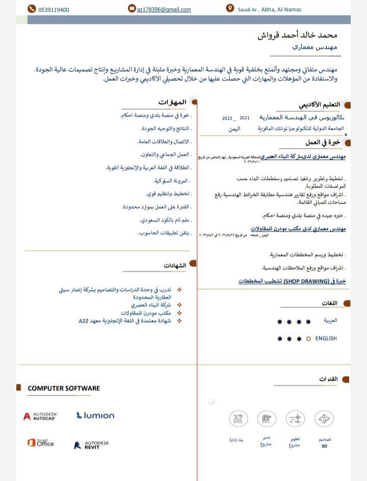بكالوريوس هندسيه معماري خبرة أربع سنوان خبرة احترافية في التعامل مع البرامج الهندسي (Revit - Lumion - AutoCAD) والاخراج للواجهات وتصميم الواجهات حسب الموجهات التصميمية للعمارة السعودية خبرة في الاشراف المواقع ملم بالكود السعودي خبرة في منصة متوسطة بلدي وإدارة المشاريع متوسطة الحجم وتحديد الجدول الزمني الإقامة ساري متواجد في الدمام