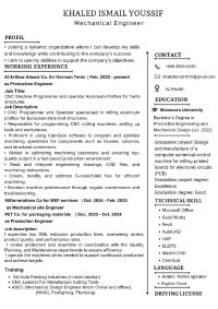 مهندس ميكانيكا بخبرة في تشغيل وبرمجة ماكينات أل CNC لتصنيع قطاعات الألومينيوم الخاصة بهياكل الخيام الأوروبية. متمكن في استخدام برامج CamQuix وMach 3 لتحسين عمليات التشغيل وضمان أعلى جودة انتاجية. لدي خبرة أيضا في الاشراف على خطوط انتاج البلاستيك ومشروعات الموقع الميكانيكي. حاصل على بكالوريوس هندسة انتاج وتصميم ميكانيكي من جامعة المنصورة، وأسعى دائما لتطوير مهاراتي والمساهمة في نجاح المؤسسة التي أ