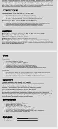 مهندس أحمد جعفر مهندس زراعي مصري متاح للعمل فورا، يمتلك خبرة عملية في إدارة وتشغيل المزارع، تشغيل وصيانة الآلات الزراعية، إدارة الصوب الزراعية، تصميم وتشغيل أنظمة الري الحديثة ونظم اللاند سكيب، الى جانب ضبط الجودة والانتاج الزراعي. متواجد حاليا بالمملكة العربية السعودية، متاح للانتقال لأي موقع عمل داخل المملكة، إقامة سارية لمدة سنة قابلة للتحويل، وجاهز للتوظيف الفوري بخبرة ميدانية عالية