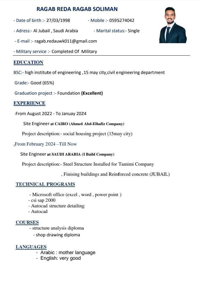 مهندس مدني موجود في الجبيل خبرة 3 سنوات إقامة سارية ومتاح نقل كفالة خبرة في مجال الخرسانات والتشطيبات وحمامات السباحة وهناجر أستيل ستراكشر