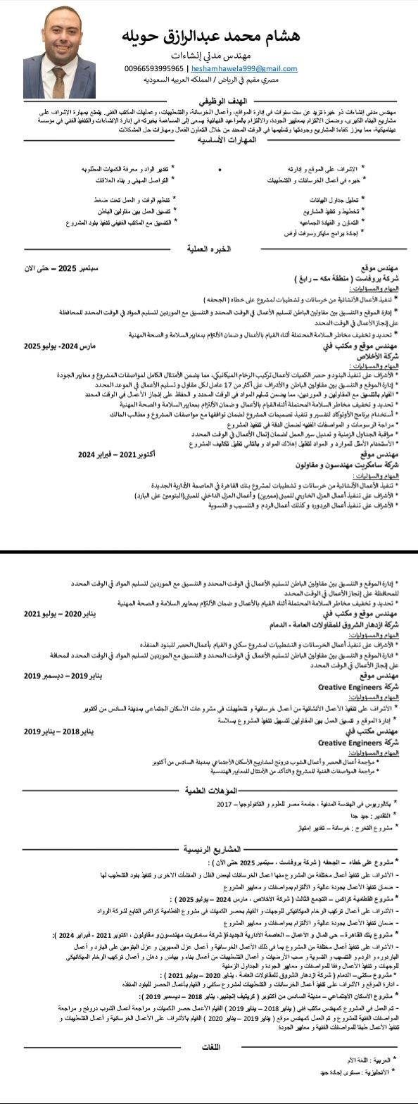 مهندس مدني انشاءات تنفيذ ومكتب فني خبرة 8 سنوات في الخرسانات والتشطيبات وحصر الكميات وإدارة الموقع والاشراف على تنفيذ واستلام البنود طبقا للرسومات والمواصفات والتنسيق بين مقاولين الباطن لتسليم الأعمال في الوقت المحدد والتنسيق مع الموردين لتسليم المواد في الوقت المحدد للمحافظة على انجاز الأعمال في الوقت المحدد ومراجعة الرسومات والمواصفات الفنيه لضمان الدقة والجودة في تنفيذ المشروع
