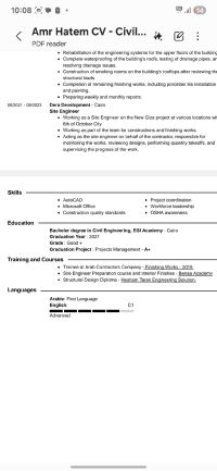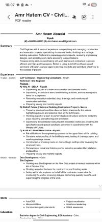 مهندس مدني مصري خبرة 4 سنوات ونصف في أعمال العظم والتشطيبات وحصر الكميات وإدارة المشاريع والتعامل مع المكاتب الاستشارية. خبرة أكثر من سنتين في المملكة بشركة مقاولات تضامن بمكتب استشارات هندسية بأعمال الاشراف علي التنفيذ للمشاريع المختلفة. إقامة سارية ورخصة قيادة سارية مقيم في الرياض