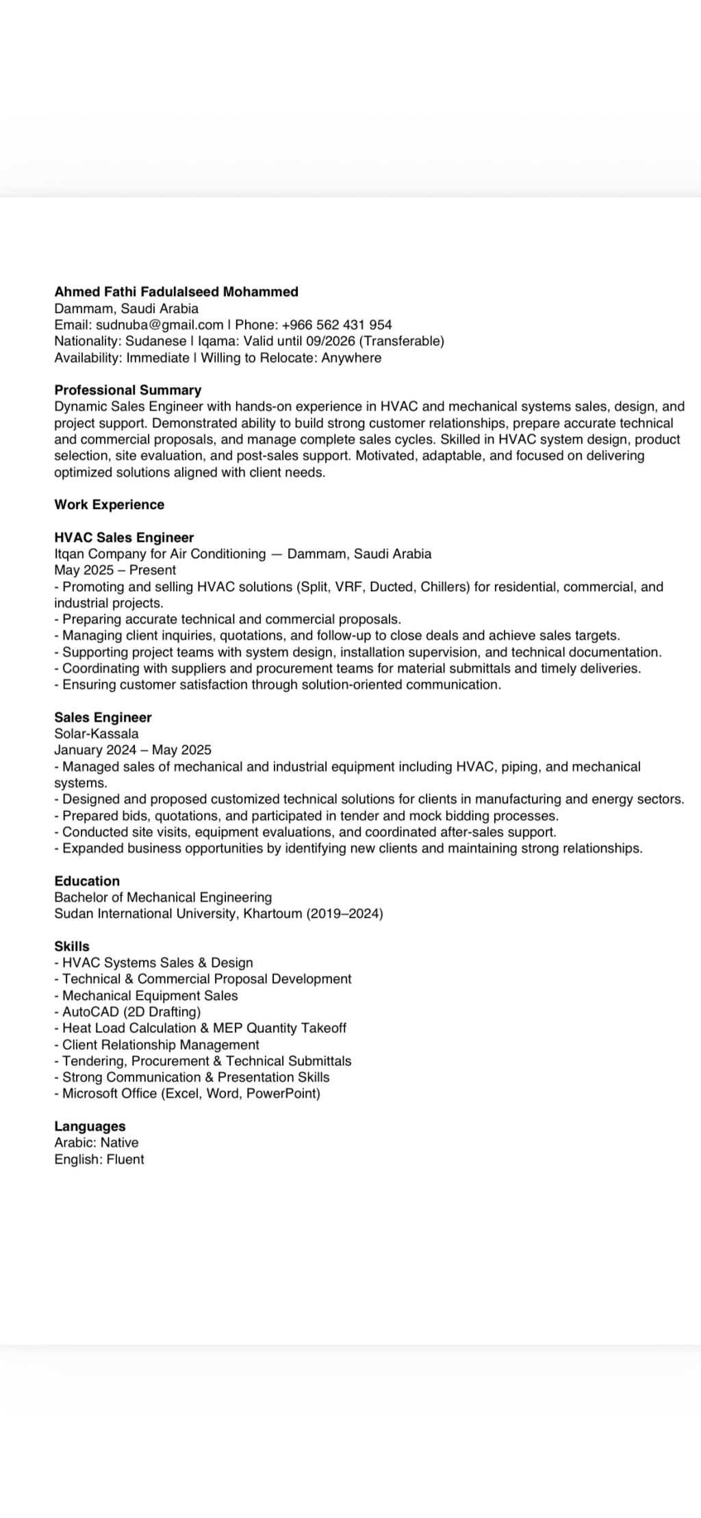 مهندس ميكانيكا مبيعات مختص في مجال التكييف الكونسيلد والباكج والتشيلر وأل vrf متواجد بالشرقية إقامة سارية 10 أشهر ورخصة قيادة سارية جاهز للعمل فورا الرجاء التواصل عبر الايميل