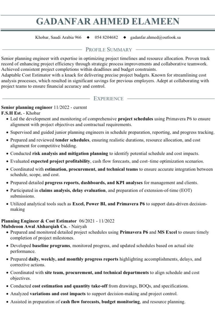 مهندس مدني خبرة أكثر من 10 سنوات خبرة في مجال التسعير ومنصة اعتماد والتخطيط وبرنامج برايم فيرا
