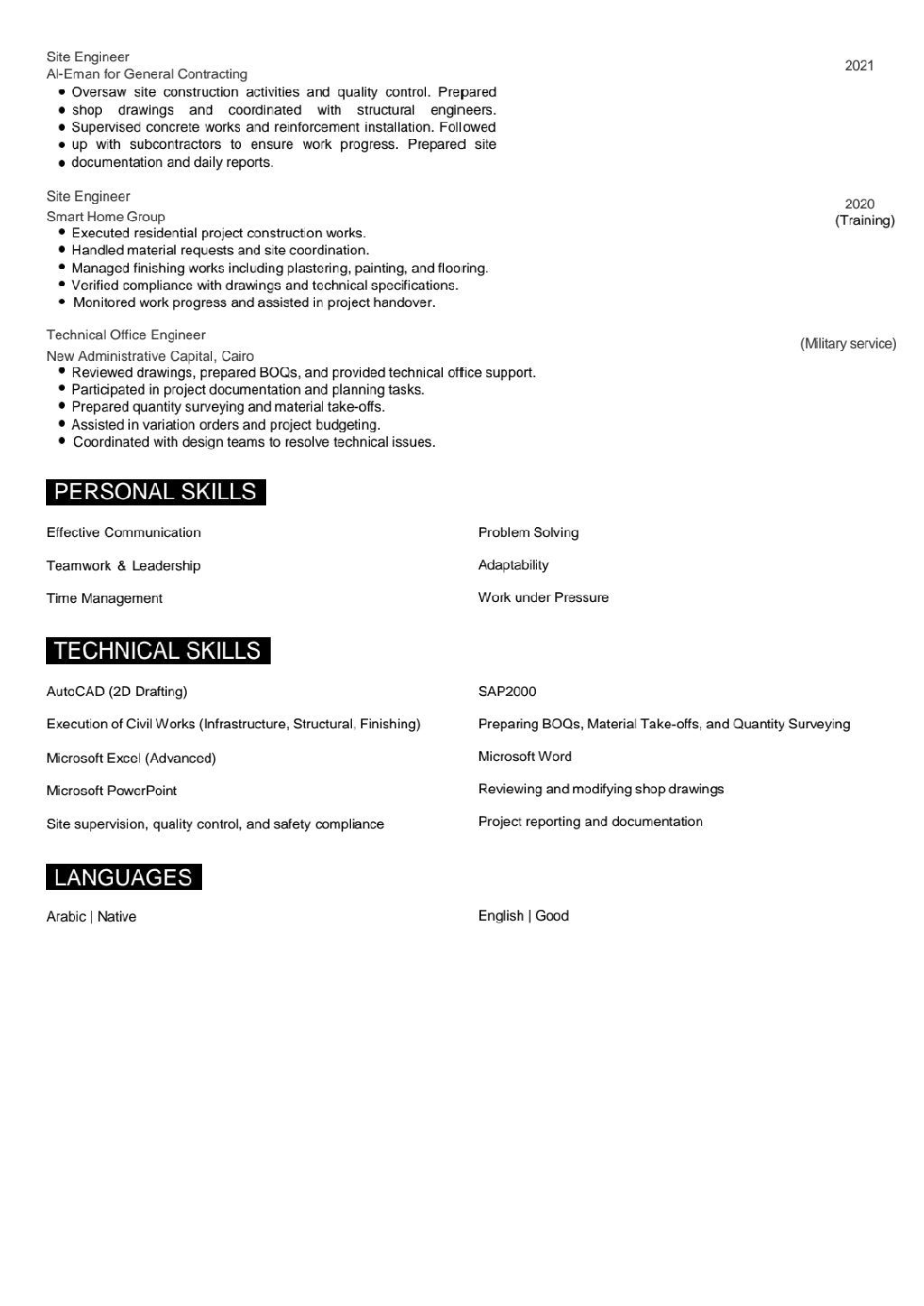 مهندس مدني خبرة 5 سنوات في مجالات الانشاءات والبنيه التحتية والتشطيبات متواجد بالمملكة العربية السعودية وعلي دراية بالبرامج الهندسية المختلفة ومعتمد من الهيئة الهندسيه السعودية (عضوية سارية) واعتماد شركة المياه الوطنيه