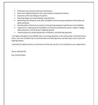 مهندس كهرباء خبرة أكثر من ثلاث سنوات في مجال الانشاءات - الاشراف على تنفيذ الأعمال الكهربائية - أعمال الصيانة والتأهيل لشبكة الانارة - تسليم جميع الأعمال الى الاستشاري - حصر الكميات وتجهيز المستخلص تمديد كابلات الجهد المتوسط - عمل اللوحات التفصيلية خبرة في تصميم الأنظمة الكهربائية للجهد المنخفض وعمل الرسومات التصميمية والتنفيذية باستخدام الاوتوكاد ومتواجد حاليا بالمملكة ومتاح نقل كفالة