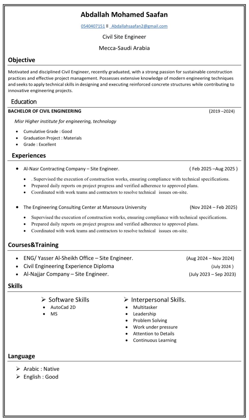 مهندس مدني تنفيذ، خبرة سنة ونصف في الانشاءات الخرسانية والبنية التحتية، استخدام جميع البرامج الهندسية، واجادة للغة الانجليزية، إقامة سارية قابلة للنقل