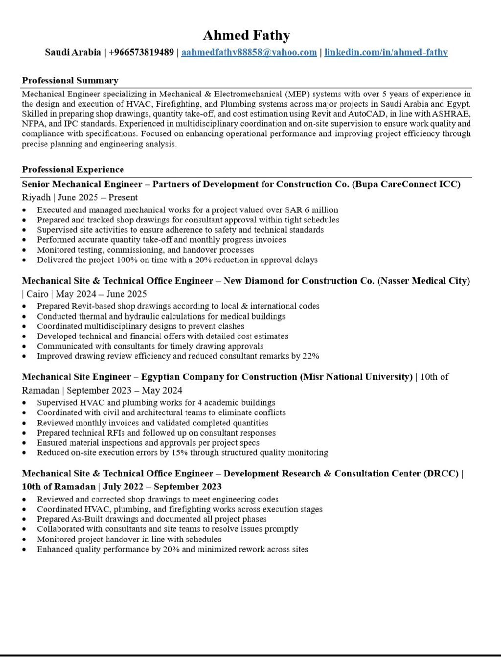 مهندس ميكانيكا خبرة 6 سنوات في مجال الأعمال الميكانيكية (MEP) داخل السعودية وخارجها، جاهز للانضمام فورا. الخبرات خبرة في التصميم - التنفيذ - الموقع - أل Shop Drawings - حسابات الأنظمة الميكانيكية. خبرة في مشاريع مستشفيات - جامعات - أبراج - مباني ادارية - مصانع. اجادة العمل على برامج AutoCAD - Revit - Office. قدرة قوية على إدارة الموقع والتعامل لدي اقامة مهندس ميكانيكا + كأردنيه هيئة