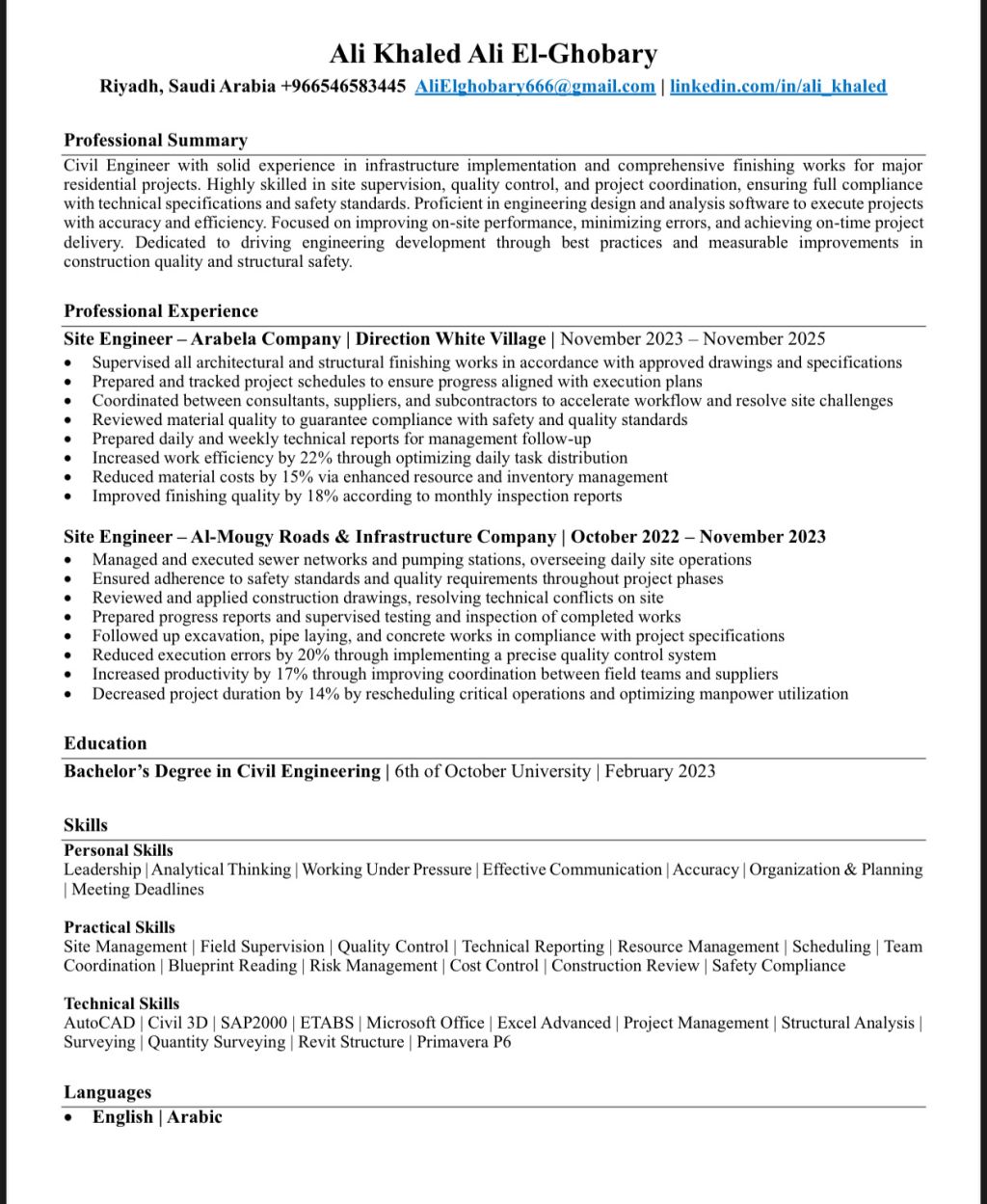 مهندس موقع مدني خبرة 3 سنين في استلام الأعمال الخرسانية والتشطيبات المتكاملة متواجد في الرياض متوفر إقامة سنة سارية ونقل كفالة