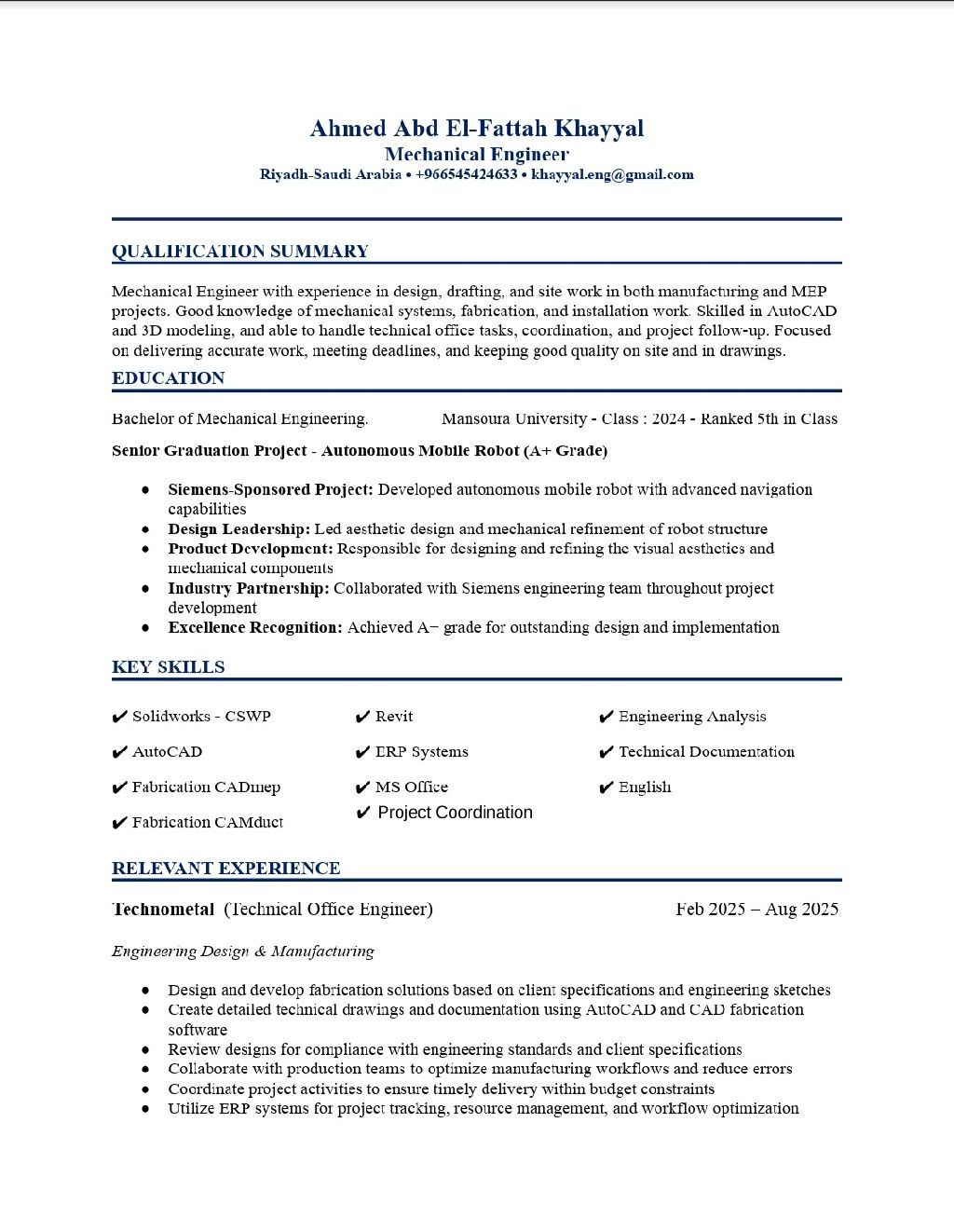 مهندس ميكانيكا خبرة في التصميم والشيت ميتال والدكت. شغل مكتب فني، رسومات، حسابات كميات، وتنفيذ موقع. مستخدم قوي ل SolidWorks وAutoCAD وCAMduct وCADmep. جاهز للشغل فورا. للتواصل واتساب أو اتصال