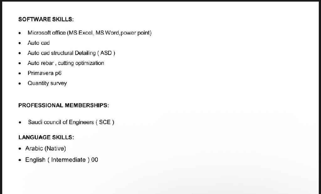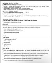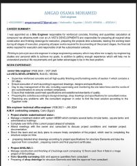 أنا مهندس مدني مصري دفعة 2017 خبرة 8 سنوات خبرة بجميع أعمال الخرسانات والتشطيبات والبنية التحتية وادارة الموقع واعداد التقارير الفنيه والتعامل مع المقاولين والعملاء. ولدي خبرة أيضا في كافة أعمال المكتب الفني من حساب الكميات والحصر الهندسي وعمل المستخلصات الجارية والنهائية والمقايسات وتجهيز لوحات الشوب دروينج ومهارات كبيرة في استخدام البرامج الهندسية مسجل هيئة مهندسين سعوديين قابل للنقل فورا
