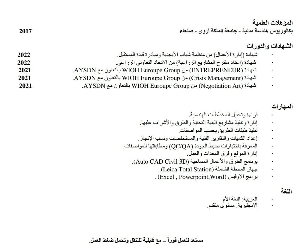 مهندس مدني طرق موقع خبرة تتجاوز 9 سنوات في إدارة وتنفيذ أعمال الطرقات والاسفلت والبنية التحتية وطبقات الرصف والاشراف عليها وادارة الموقع والمعدات مسجل لدى الهيئة السعودية للمهندسين إقامة سارية قابلة للتحويل ورخصة قيادة متواجد في الرياض قابل للعمل في أي منطقة