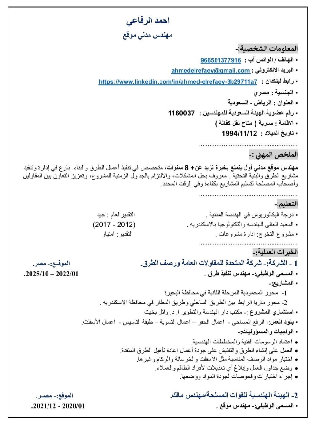 مهندس مدني طرق خبرة 8 سنوات في تنفيذ وصيانة واشراف مشاريع الطرق ومختلف أنواعها مع الالتزام التام بالجودة والمواصفات الفنية وتسليم المشاريع في وقتها ولدى اعتماد الهيئة السعودية للمهندسين ومتاح نقل كفالة ومتواجد حاليا في السعودية الرياض وابحث عن فرصة عمل مناسبة في مجال الطرق والبنية التحتية داخل المملكة