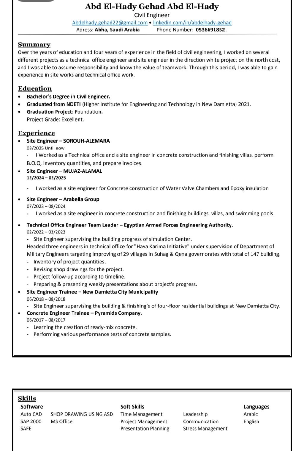 مهندس مدني خبرة 4 سنوات أجيد أعمال الموقع والمكتب الفني متواجد حاليا في أبها وابحث عن فرصة عمل