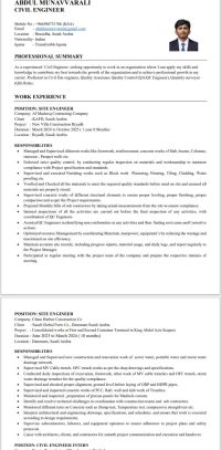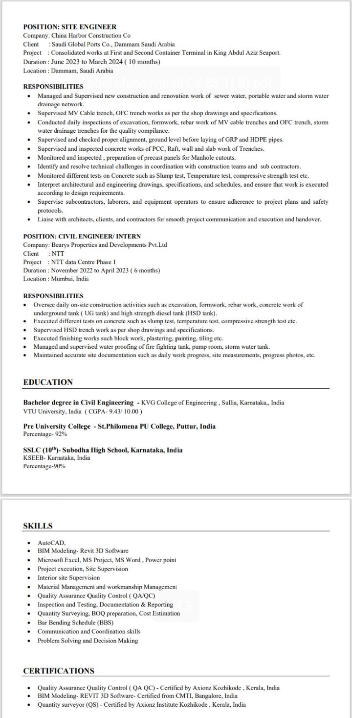 أنا عبد المنعمورالي، حاصل على بكالوريوس في الهندسة المدنية. أعيش حاليا في بريدة، المملكة العربية السعودية، وأصلي من ولاية كير لا، الهند. لدي خبرة ثلاث سنوات كمهندس مواقع، وأجيد استخدام برامج AutoCAD وRevit 3D وMS Office وضبط الجودة وضمان الجودة ومسح الكميات، الخ