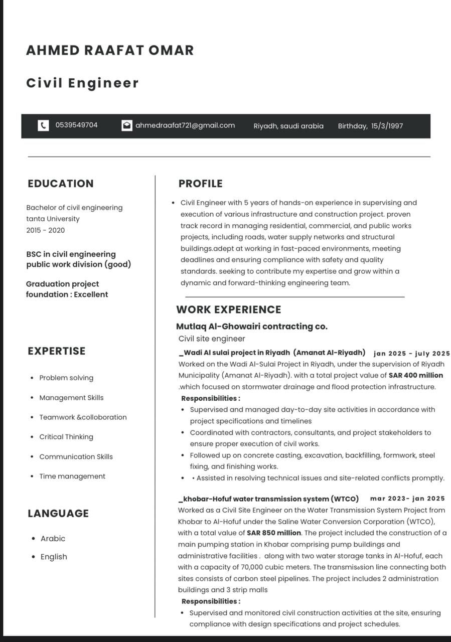 مهندس مدني خبرة 5 سنوات في مجال البنيه التحتية محطات المياه ومجال الانشاءات مباني اداريه ومولات تجاريه