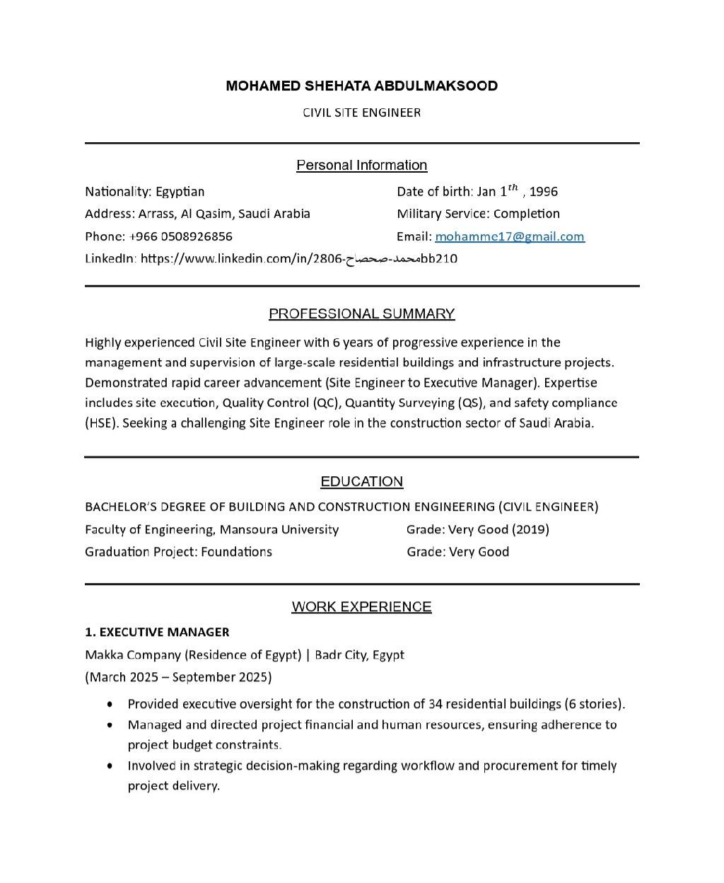 أنا مهندس مدني عملت كمدير تنفيذي خبرة 6 سنوات في أعمال الخرسانات والتشطيبات الداخلية والخارجية، مقيم في السعودية، مسجل في الهيئة السعودية للمهندسين، ومعي إقامة سارية، ورخصة قيادة، ومتاح نقل كفالة، وجاهز للعمل