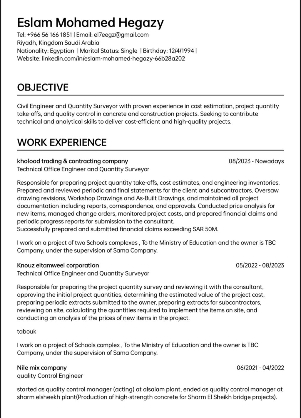 مهندس مدني - حاسب كميات خبرة 7 سنوات منها 4 سنوات داخل السعودية في مجال حساب الكميات. لدي خبرة قوية في اعداد وحصر الكميات بدقة عالية - اعداد أل BOQ والتسعير والمراجعات - أعمال المكتب الفني والتنسيق مع الأقسام المختلفة - العمل على مشاريع حكومية وبني تحتية ابحث عن فرصة مناسبة في شركة محترمة أقدر أضيف ليها بخبرتي، والتفرغ للعمل بشكل كامل. للتواصل