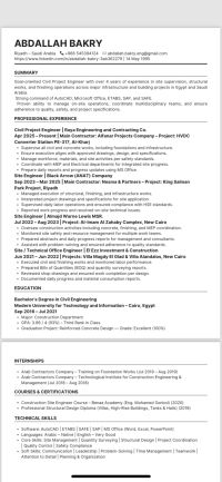 مهندس مدني مصري متواجد في الرياض متاح للعمل في جميع أنحاء المملكة خبرة 5 سنوات في تنفيذ واستلام جميع أعمال الخرسانات والتشطيبات وحصر البنود الانشائية والمعمارية وعمل المستخلصات وإدارة المواقع والتعامل مع المقاولين والتعامل مع منصة اعتماد، عملت في مشروعات (مولات - فلل - مستشفيات - مشروع حديقة الملك سلمان - محطة كهرباء جنوب الرياض لدي رخصة قيادة إقامة سارية مع امكانية نقل كفالة جاهز للعمل والانضمام الفوري