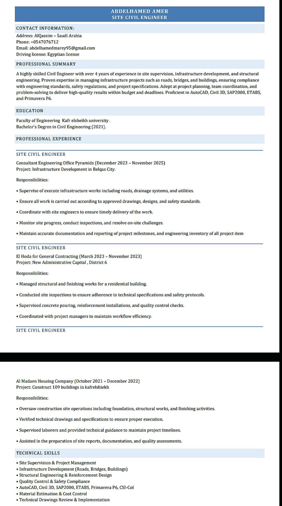مهندس مدني خبرة 4 سنوات موجود حاليا في القصيم سبق العمل في أعمال الإنشاءات (الخرسانات والتشطيبات) للمنشاءات السكنية وفي أعمال البنية التحتية مع اجادة حصر الكميات وعمل المستخلصات واستخدام برنامج AutoCAD وMs office ابحث عن فرصة عمل مناسبة في أي مكان في المملكة العربية السعودية