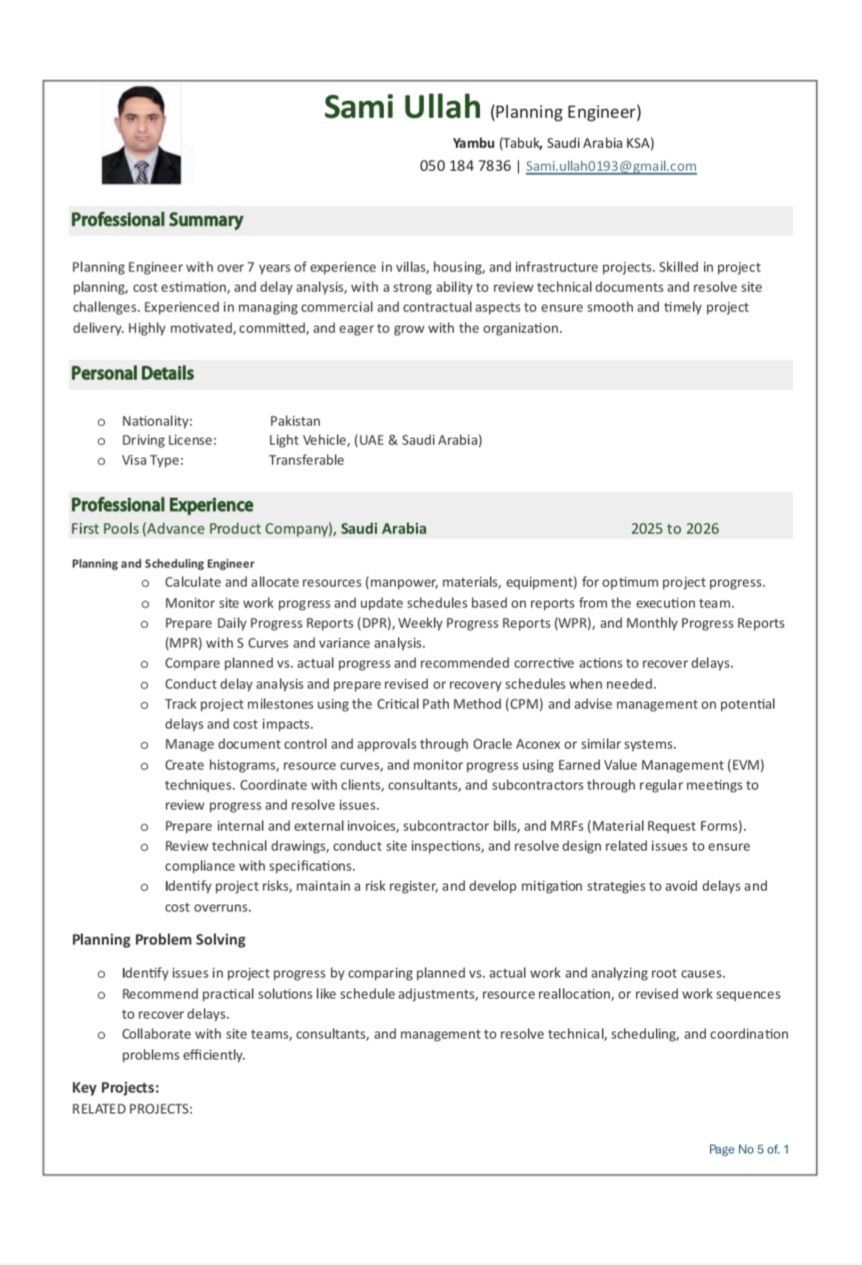 Samiullah, a Planning Engineer with 7 + years in villas, housing, and infrastructure. Expert in project planning, cost estimation, and delay analysis. Proficient in technical document review and site challenge resolution. Manages commercial and contractual aspects for smooth, timely delivery. Highly motivated and eager to grow