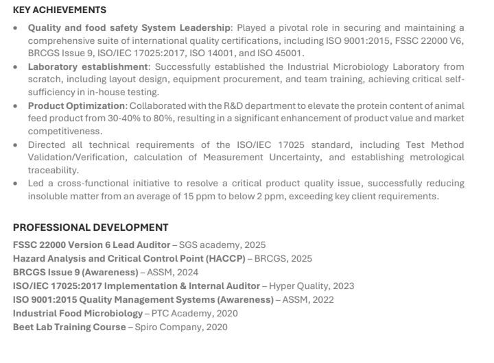 خبير جودة وسلامة غذاء قادر على تأسيس وتشغيل نظام متكامل للجودة وسلامة الغذاء وفق FSSC 22000 وBRCGS وISO 9001/ 14001/ 45001 امتلك خبرة عملية في تصميم وبناء وتشغيل معمل كيمياء وميكرو من الصفر حتى الاعتماد وفق ISO / IEC 17025، مع إدارة التحاليل اليومية وتدريب الفريق ووضع الاجراءات والتقارير والعمل علي التحسين المستمر مما يضمن خفض الهدر ورفع كفاءة التشغيل وتعظيم ربحية المصنع والحفاظ على رضا العملاء