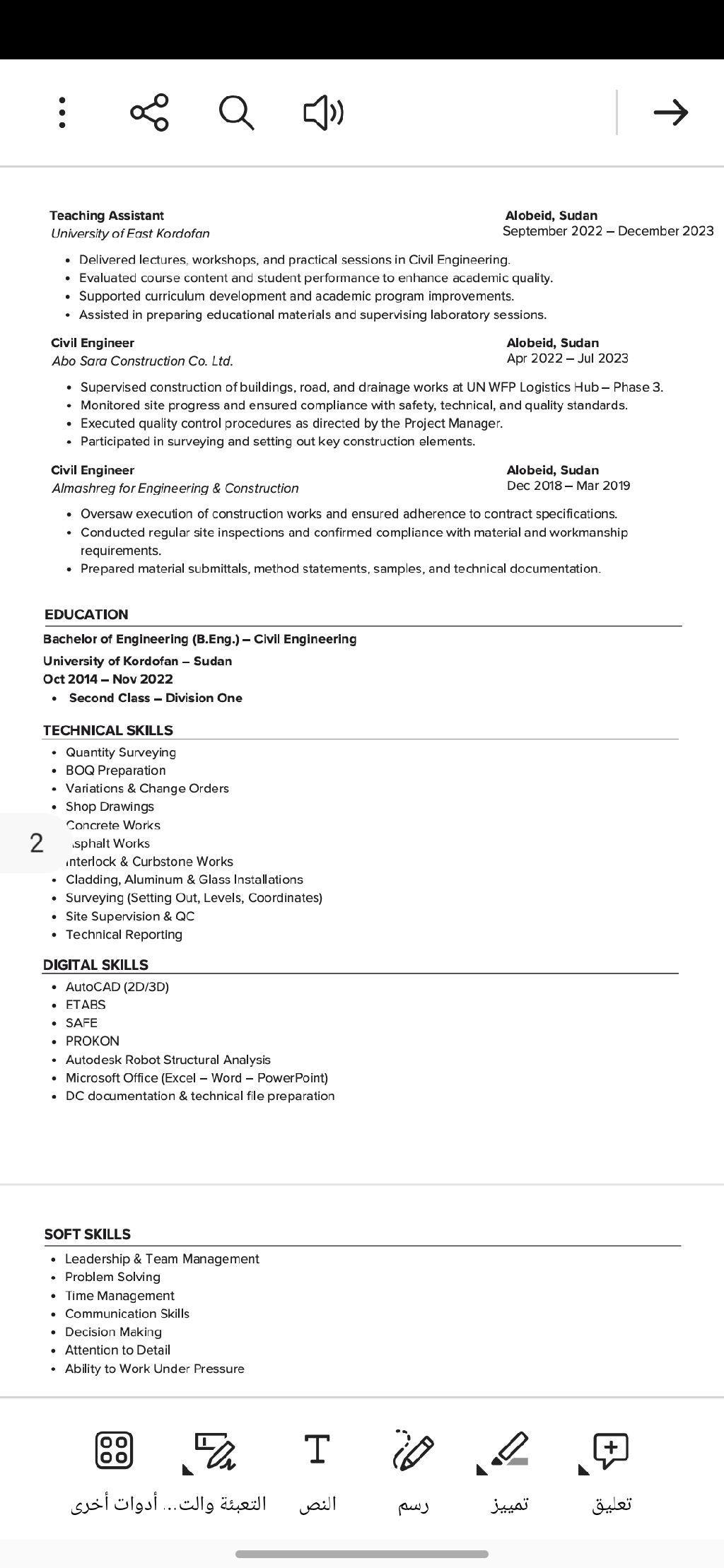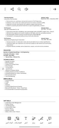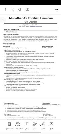 أنا مهندس مدني ابحث عن فرصة عمل مناسبة داخل المملكة العربية السعودية. لدي خبرة في المكتب الفني والعمل كمهندس موقع، بالاضافة الى إدارة الموقع والاشراف على جميع الأعمال التنفيذية. كما اعمل ك Document Controller (DC) بخبرة قوية في إدارة الوثائق الفنية والتحكم بها عبر منصة Aconex باحترافية عالية