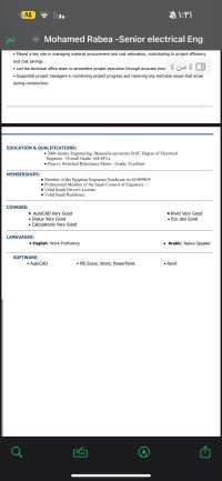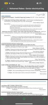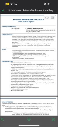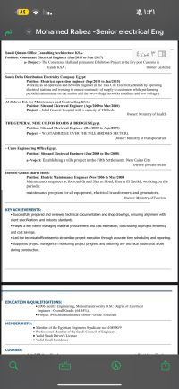 مهندس كهرباء حاصل على درجه البكالوريوس في هندسة القوى الكهربائية دفعه 2006 ولدي خبرة عملية في قطاع المقاولات والاستشارات الهندسيه والتسعير ومتاح نقل كفالة وباقي التقاصيل بالسيرة الذاتية موجودة عند الطلب
