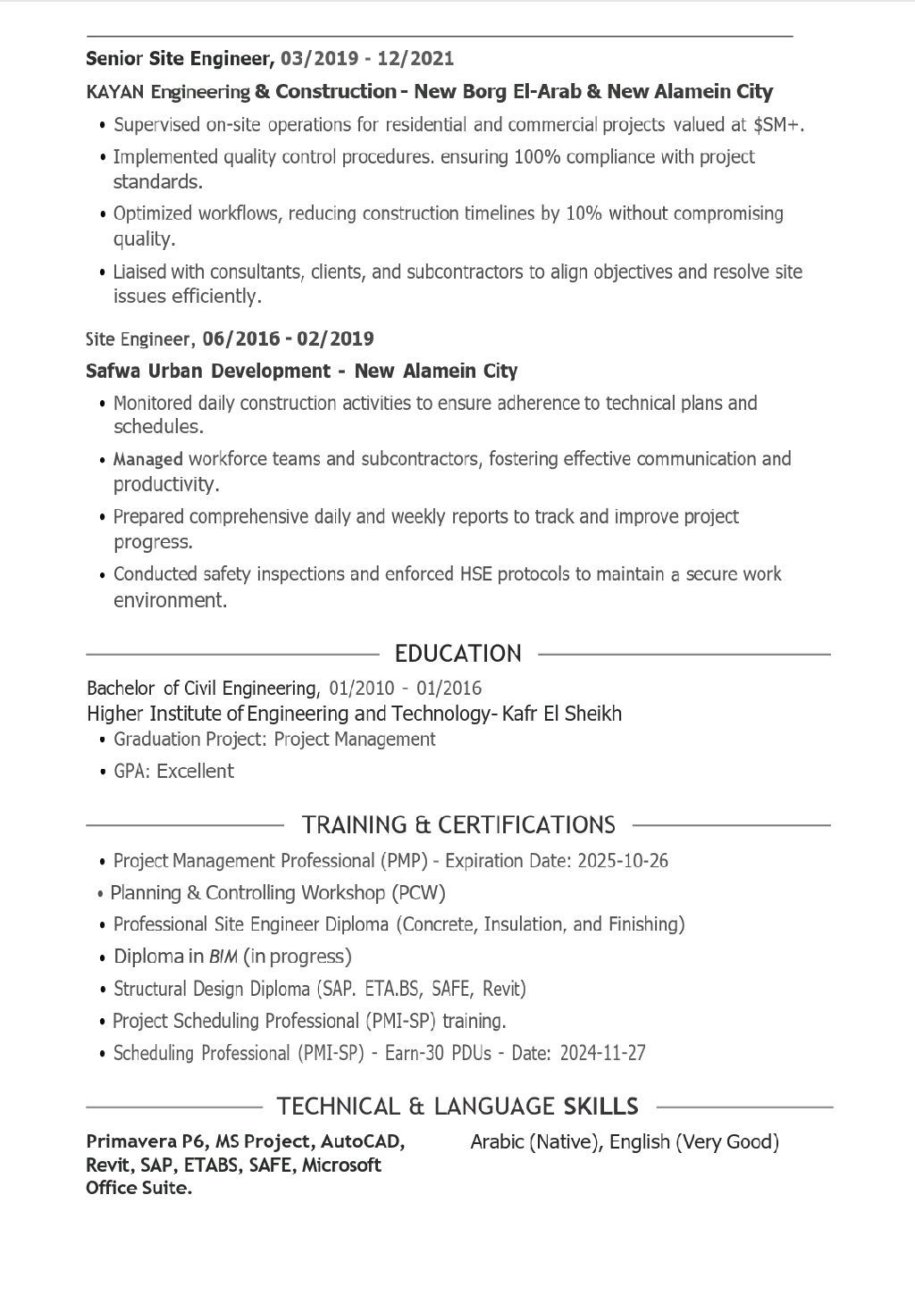 مهندس مدني محترف - 9 سنوات خبرة حاصل على PMP خبرة 9 سنوات في مجال الإنشاءات وإدارة المشاريع. المؤهلات والخبرات حاصل على شهادة PMP (إدارة المشاريع الاحترافية) خبرة واسعة في أعمال التنفيذ الميداني وإدارة المشاريع تخطيط ومتابعة المشاريع وعمل البرامج الزمنية الدقيقة اعداد التقارير الفنية والادارية اللازمة خبرة في أنظمة الجودة واعداد ISO 9001 خبرة في أعمال المكتب الفني والرسومات