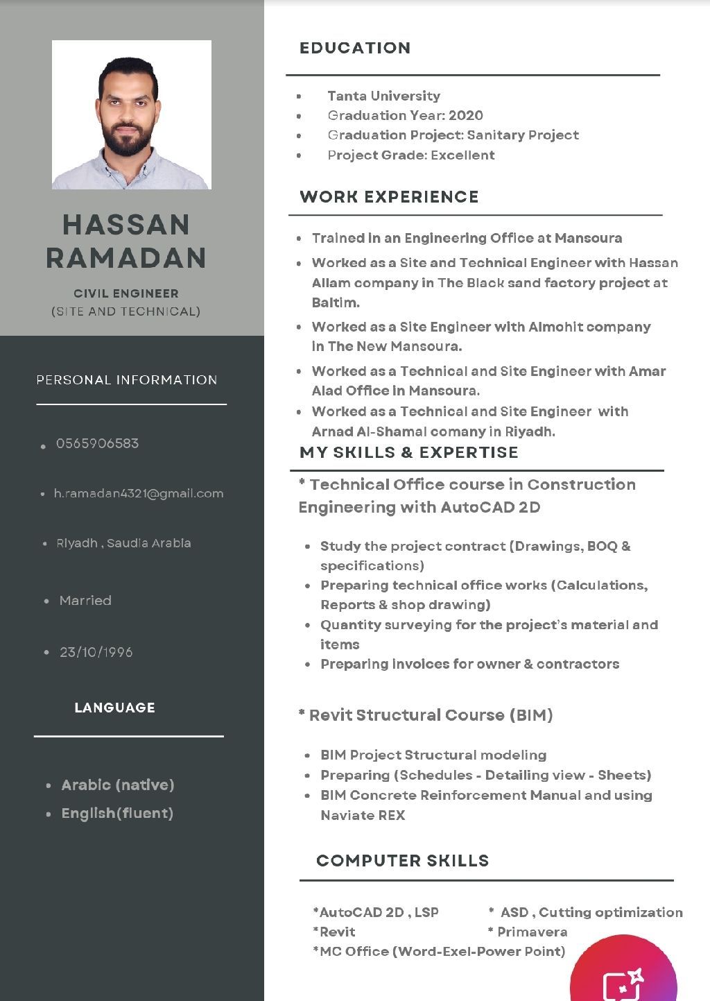مهندس مدني في الرياض خبرة أكثر من 5 سنوات بالموقع والمكتب الفني كالحصر وعمل المستخلصات وعروض الأسعار والشوب دروينج وتنفيذ الخرسانات وأعمال العزل المائي والحراري وخبرة بالبرامج الهندسة كالاوتوكاد والريفيت والأكسيل ولدي رخصة قيادة وإقامة سارية وايجاده اللغة الانجليزية