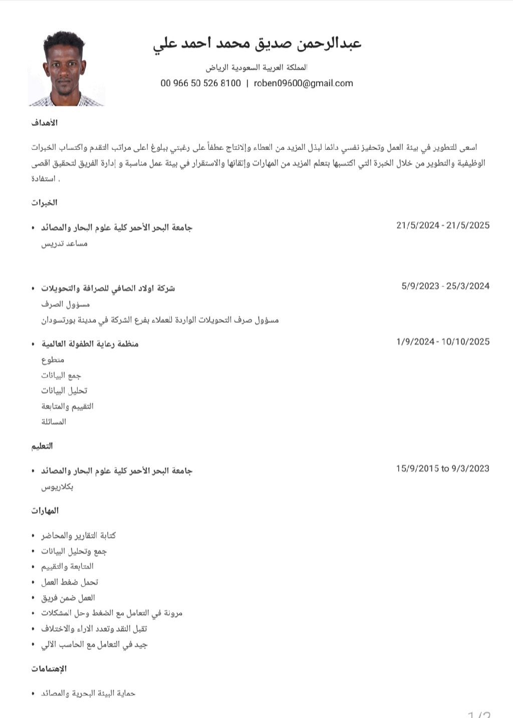 مهندس إستزراع سمكي الاسم عبد الرحمن صديق - سوداني المؤهل بكالوريوس علوم البحار والمصائد ابحث عن وظيفة في الاستزراع السمكي - الاشراف - خدمة عملاء - تنسيق اداري - أو أي عمل مناسب
