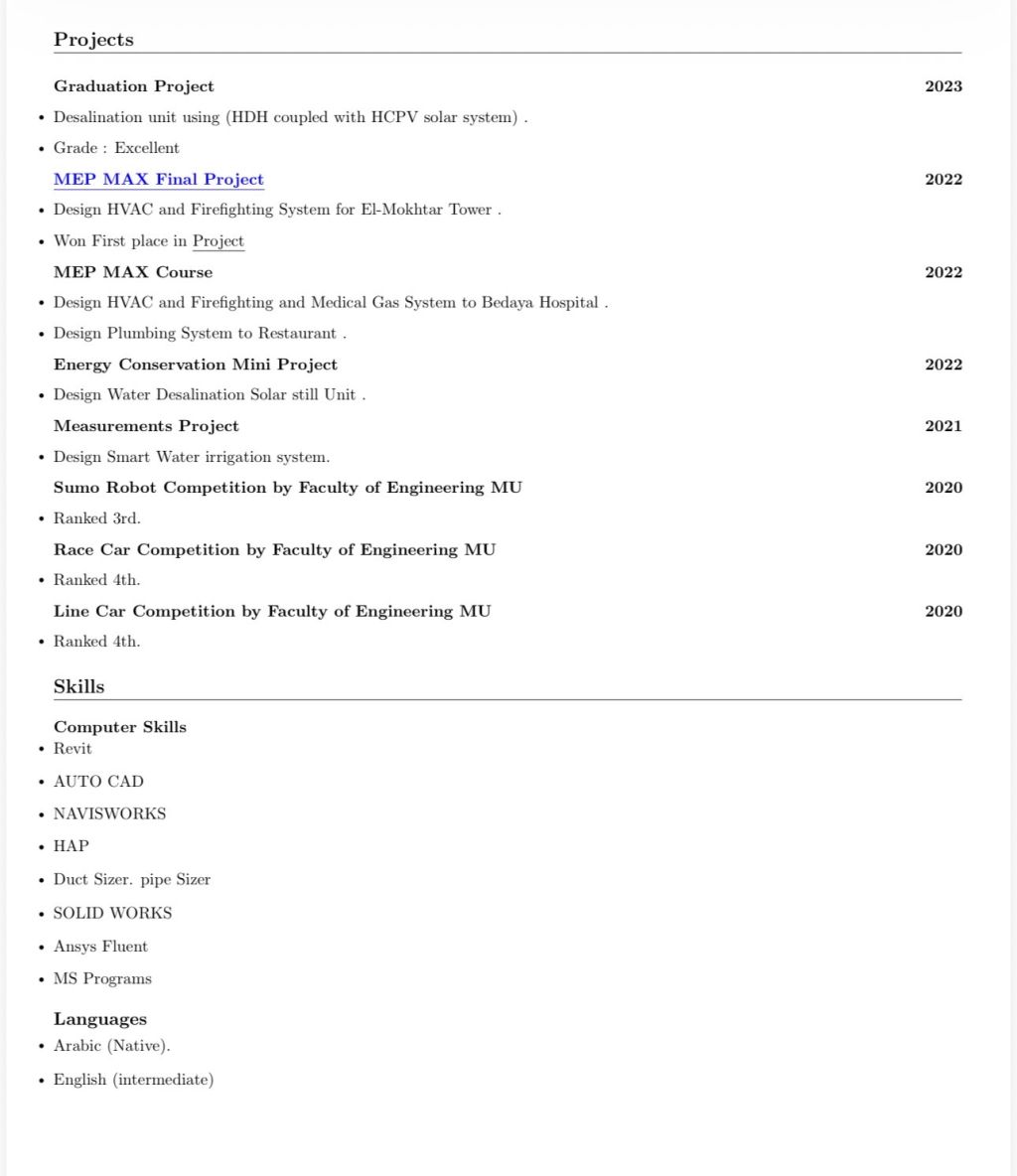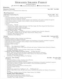 مهندس ميكانيكا خبرة سنتين في مجال أنظمة التكييف (HVAC) ومكافحة الحريق وتغذية المياه والصرف الصحي. لدي خبرة عملية في التنفيذ والاشراف بالمواقع، والقدرة على التعامل مع المخططات، وحساب الكميات، ومتابعة أعمال المقاولين والموردين