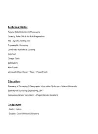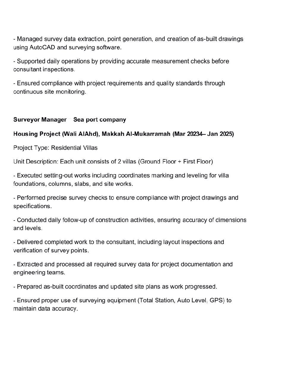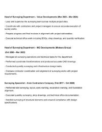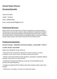 مساح مقيم بمدينة جدة يمتلك خبرة واسعة في مجال الإنشاءات، ويجيد العمل في الموقع والمكتب الفني. لديه قدرة عالية على استخراج البيانات المساحية، وحصر الكميات، واعداد التقارير والرسومات اللازمة للمشروعات. متمكن من استخدام اجهزة المساحة المختلفة مثل التوتال استيشن، ميزان القامة، واجهزة أل GPS، مع مهارة في معالجة البيانات باستخدام البرامج الهندسية المتخصصة