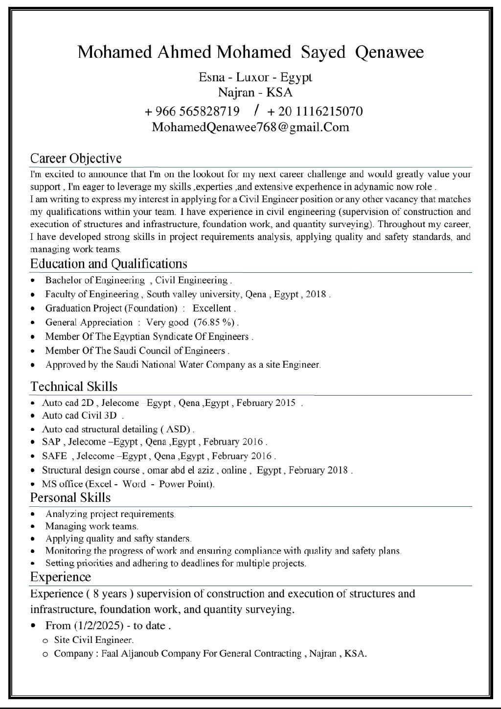 مهندس مدني (دفعة 2018) خبرة 7 سنوات في مجال الهندسة المدنية - عضو في الهيئة السعودية للمهندسين - اعتماد من شركة المياه الوطنية. خبرة في (الاشراف على التنفيذ - أعمال التنفيذ للمنشاءات السكنية والبنيه التحتية - أعمال الأساسات - حصر الكميات) وخلال مسيرتي المهنية، اكتسبت مهارات قوية في تحليل متطلبات المشروع، وتطبيق معايير الجودة والسلامة، وإدارة فرق العمل. متاح نقل كفالة - رخصة قيادة سارية