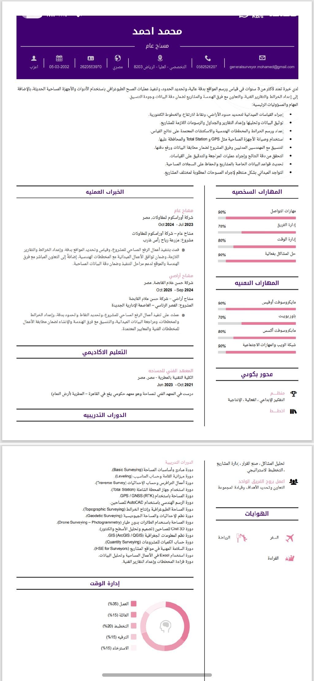 مساح عام خريج معهد مساحة حكومي عضو لدى الهيئة السعودية للمهندسين أتقن العمل على جميع الاجهزة level, Total station, Gps والبرامج Atou Cad 2d, civil 3d