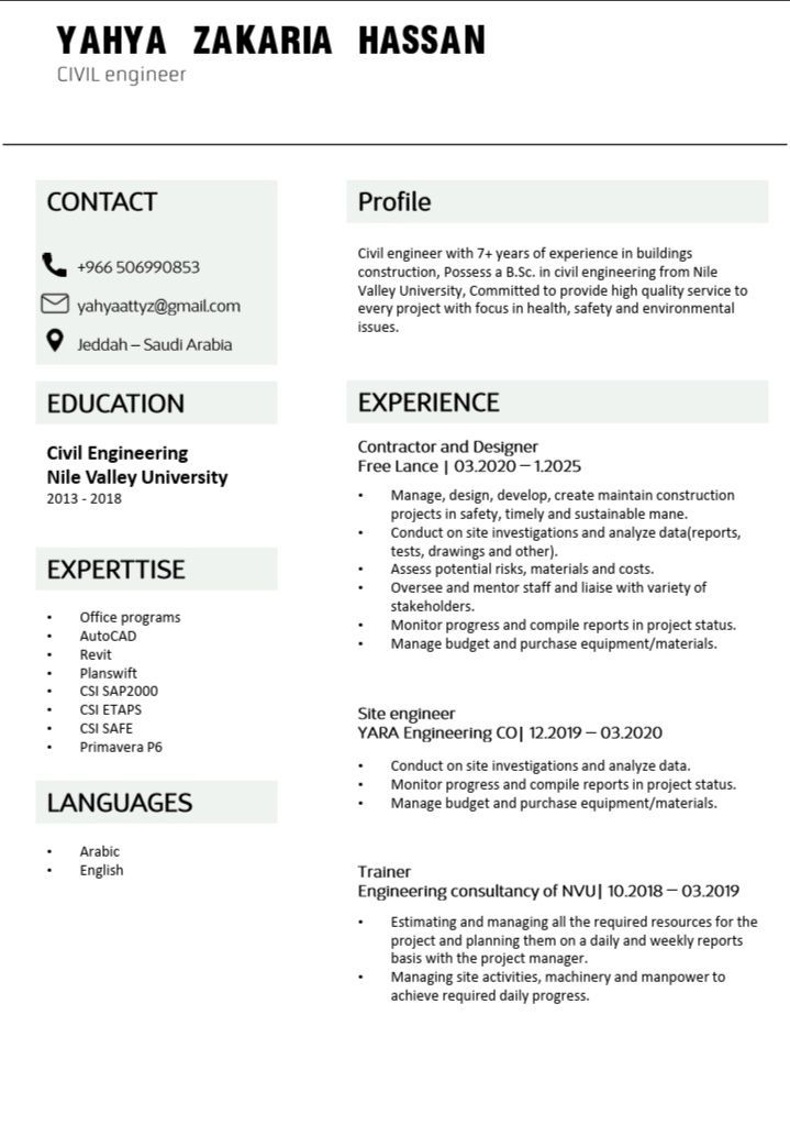 أنا يحيى زكريا حسن، مهندس مدني حاصل على بكالوريوس الهندسة المدنية من جامعة وادي النيل، ولدي 7 سنوات خبرة في تنفيذ المباني وإدارة المشاريع. المهارات الأساسية الاشراف والتنفيذ وإدارة المواقع حساب الكميات واعداد التقارير متابعة التقدم وتقييم المخاطر برامج AutoCAD - SAP2000 - ETABS - SAFE - Planswift - Primavera P6 - MS Office