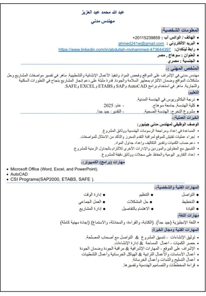 مهندس مدني خريج جامعة حكوميه ذو خبرة علي الاشراف علي الانشاءات والتشطيبات والتنفيذ بجودة عالية طبقا للمواصفات