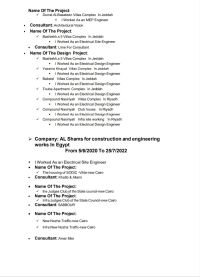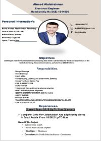 أنا أحمد عبدالرحمن. مهندس كهرباء خبرة في التنفيذ والتصميم مسجل بالهيئة ابحث عن فرصة عمل جديدة وجاهز للعمل ومتاح نقل كفالة