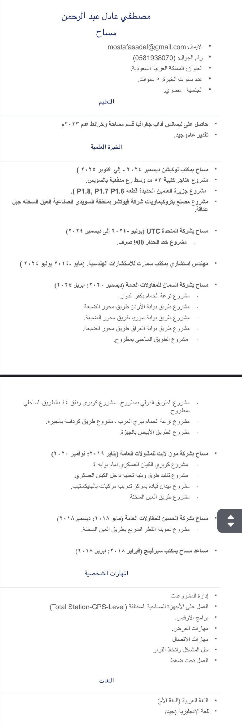 مساح متواجد في السعودية ابحث عن فرصة عمل أجيد التعامل ع جميع الاجهزة المساحية (level / total station/ Gps) وأجيد التعامل ع برنامج الكاد خبرة 5 سنوات في مجال الطرق والإنشاءات والبنية التحتية والتسويات واللاند سكيب والأستيل ومتاح نقل كفالة