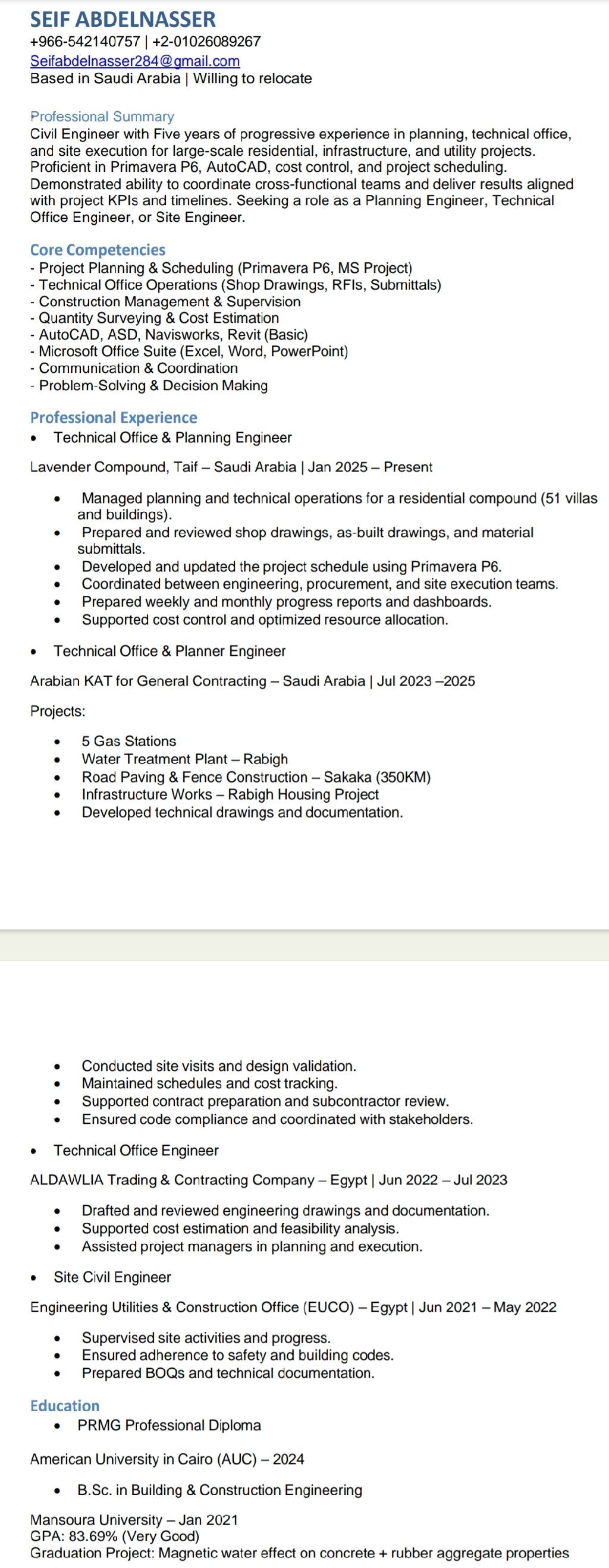 مهندس مدني خبرة 5 سنوات داخل مجال الإنشاءات، ابحث عن فرصة عمل مناسبة داخل السعودية في أحد التخصصات التالية مهندس موقع - مهندس مكتب فني - مهندس تخطيط (Planning) أقدر أضيف لقيمة شغلك أيه اشراف كامل على تنفيذ الأعمال بالموقع طبقا للمخططات اعداد وحصر الكميات وجداول أل BOQ بدقة متابعة البرامج الزمنية ونسب الانجاز اعداد المخاطبات الفنية وطلبات المعماريه متاح للعمل فورا - مرن بين الموقع والمكتب الفني