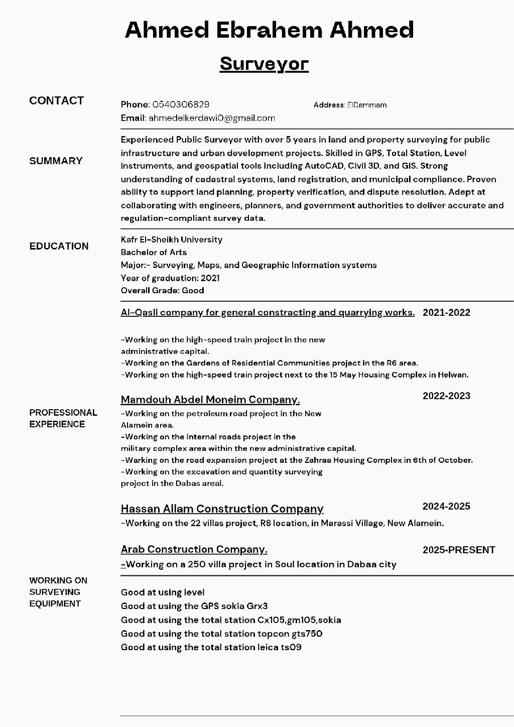 ابحث عن عمل في مجال المساحة في الطرق أو الانشاءات ميزان وتوتال استيشن، موجود في الدمام وتوجد إقامة سارية سنة