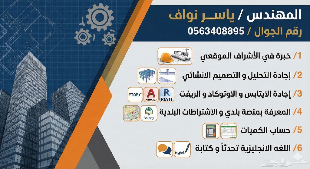 مهندس مدني انشائي خبرة في الاشراف على بنود أعمال العظم والتشطيبات وحساب الكميات وعمل اللوحات الانشائية والمعمارية، اجادة التعامل مع منصة بلدي وعندي لغة انجليزية