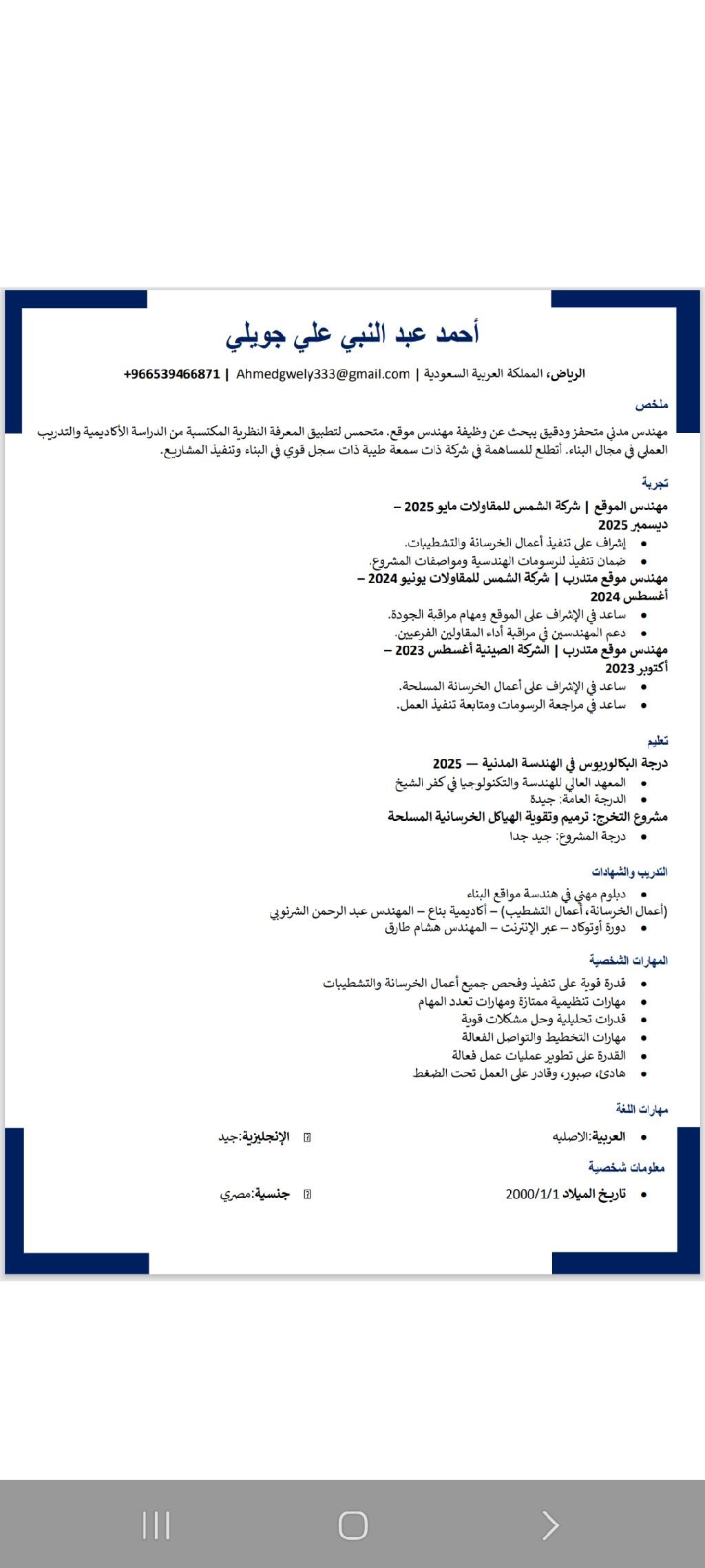 مهندس مدني تنفيذ (مصري) خبرة سنة خبرة عملية في أعمال الخرسانات والتشطيبات