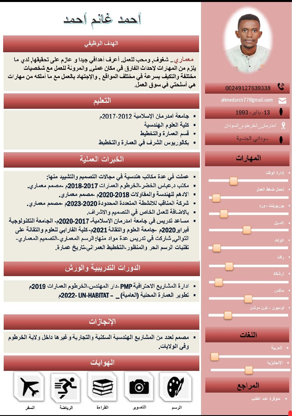 مهندس معماري ذو خبرة معيد سابق وأستاذ في جامعة أم درمان الاسلامية وأفريقيا العالمية متخصص تصاميم جميع البرامج المعمارية. تنفيذ وادارة الم شارع والمخططات موجود الآن في مكة بتأشيرة عمل. وهو جاهز لمباشرة العمل ويطلب نقل كفالة