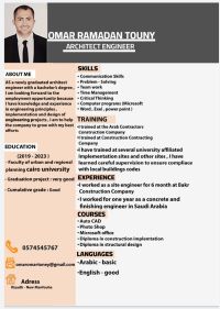 مهندس معماري خريج جامعة القاهرة 2023 اشتغلت لمدة 6 شهور مهندس موقع في شركة كونستركشن للمقاولات واشتغلت لمدة سنة ونصف مهندس موقع خرسانات وتشطيبات معمارية وتشطيبات الفنادق في السعودية أجيد استخدام برامج الاوتوكاد - الأكسيل - الوورد - البوربوينت - الفوتوشوب ابحث عن فرصة عمل عمل