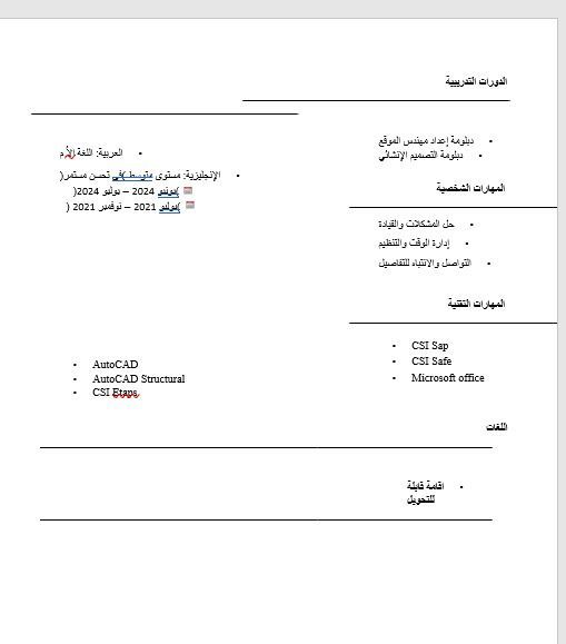 مهندس مدني يتمتع بخبرة تزيد عن سنتين في الاشراف الميداني والتنفيذ الهيكلي وأعمال التشطيب واسعة النطاق. أثبت قدرة عالية على قيادة فرق العمل في المواقع والتنسيق مع المقاولين من الباطن، مع الالتزام بمعايير السلامة والجودة. ماهر في متابعة تقدم المشاريع، وحل المشكلات الميدانية، واعداد الكميات والوثائق الفنية بدقة باستخدام في رام AutoCAD. وحزمة Microsoft Office. متحفز للعمل في بيئة مهنية تشجع على التطوير