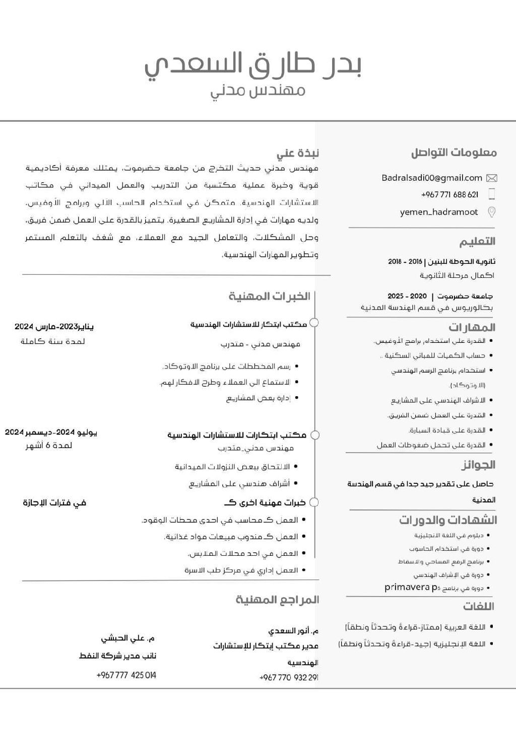 مهندس مدني مميز للانضمام لفريقك بشوش، اجتماعي، وملتزم، أتمتع بمعرفة هندسية جيدة وخبرة عملية ضمن فرق العمل. متمكن من الاشراف الموقعي، متابعة التنفيذ، وقراءة المخططات، ولدي خبرة في AutoCAD وMicrosoft Office وخصوصا Excel. أحب التعلم والتطور وأسعى دائما لاضافة قيمة حقيقية لأي مشروع أشارك فيه