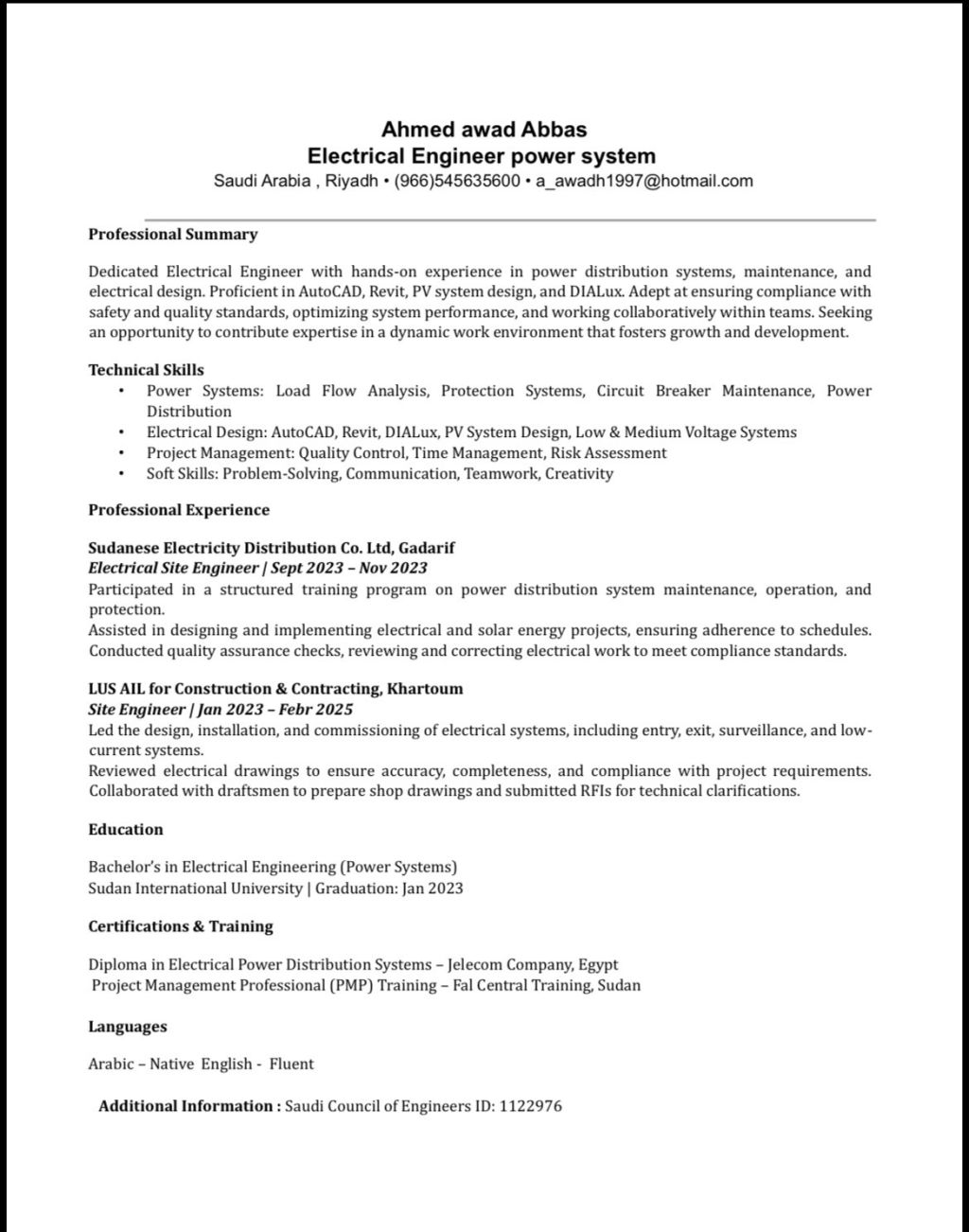 مهندس كهربائي حديث تخرج 2023 ابحث عن فرصة عمل دائمة خبرة سنتين في السودان وأجيد استخدام برنامج الاوتوكاد والدايلوكس وأحمل العضوية في الهيئة السعودية للمهندسين وإقامة سارية ورخصة قيادة سارية