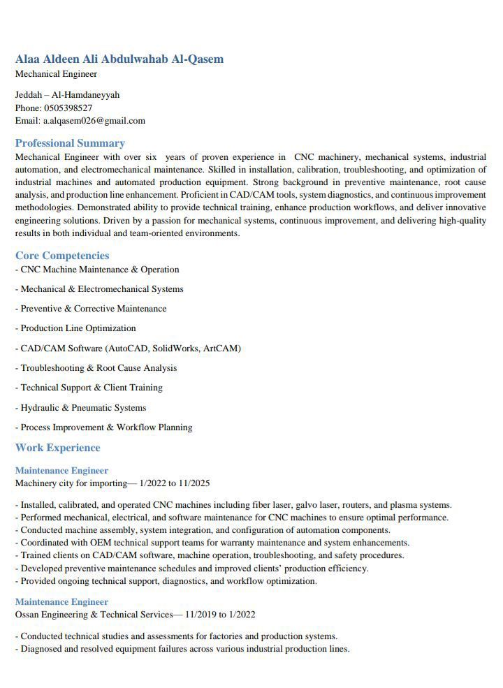 مهندس ميكانيكا خبرة أكثر من ست سنوات في مجال صيانة مكائن cnc بمختلف أنواعها وخطوط الانتاج الصناعية وتركيب وتشغيل وصيانة الأنظمة الالكتروميكانيكية
