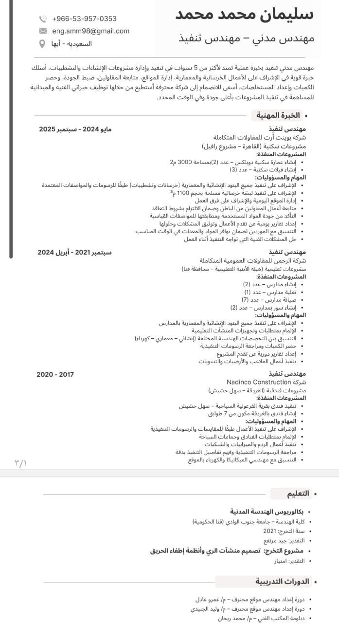 مهندس مدني خبرة 4 سنوات. في السعودية. خريج 2021. جامعة قنا الحكوميه خبرة في تنفيذ الأعمال الخرسانية والتشطيبات واستلام وتسليم البنود وإدارة الموقع بما فيه من مقاولين وموردين وعمال والتحكم في استهلاك الخامات وكذلك خبرة بأعمال الحصر والمستخلصات أبرز المشاريع 2 برج سكني 3 فلل 9 مدارس